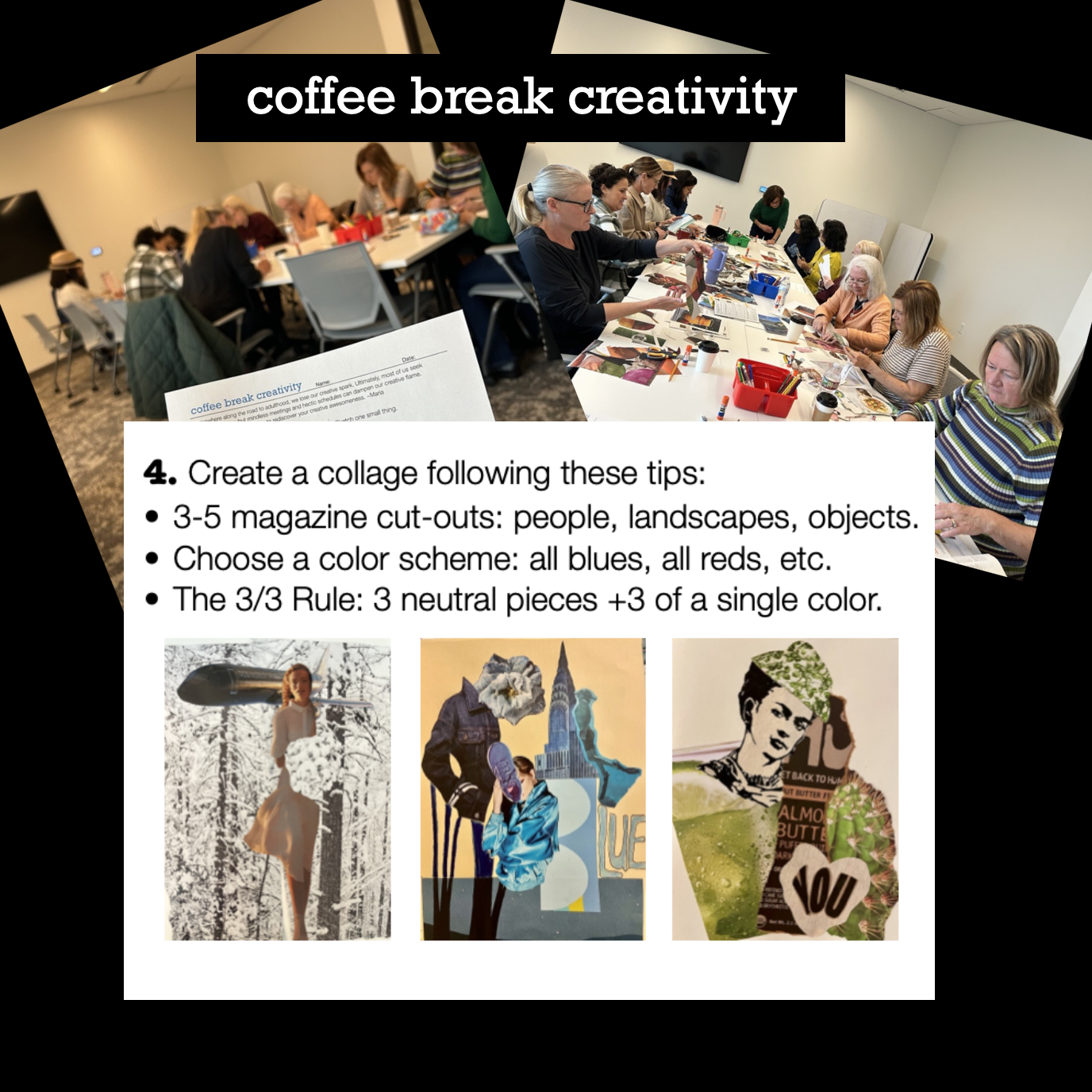 /I recently held a Coffee Break Creativity class at Cedar Park Library. The collage segment was everyones favorite as expected. Collaging is pretty popular all over social media. It’s an easy way to create a fun piece with little to no expectations or talent. I find that it helps if I place a few guidelines for my audience to choose from. After that, it’s easier for them to bend the rules and add some personal creativity to their piece. Collaging has a way of surprising us. We don’t know what the end piece will be until we see it.